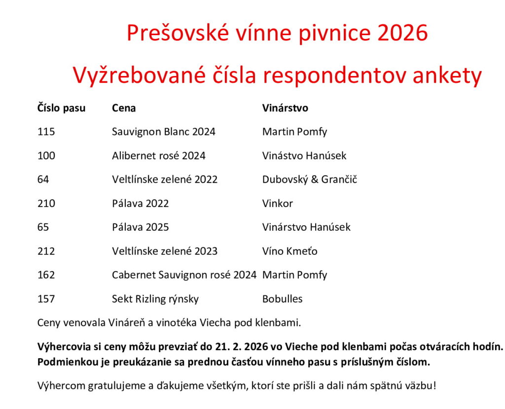Výhry si bude možné vyzdvihnúť vo Vieche pod klenbami do 21. 2. 2026 vrátane.