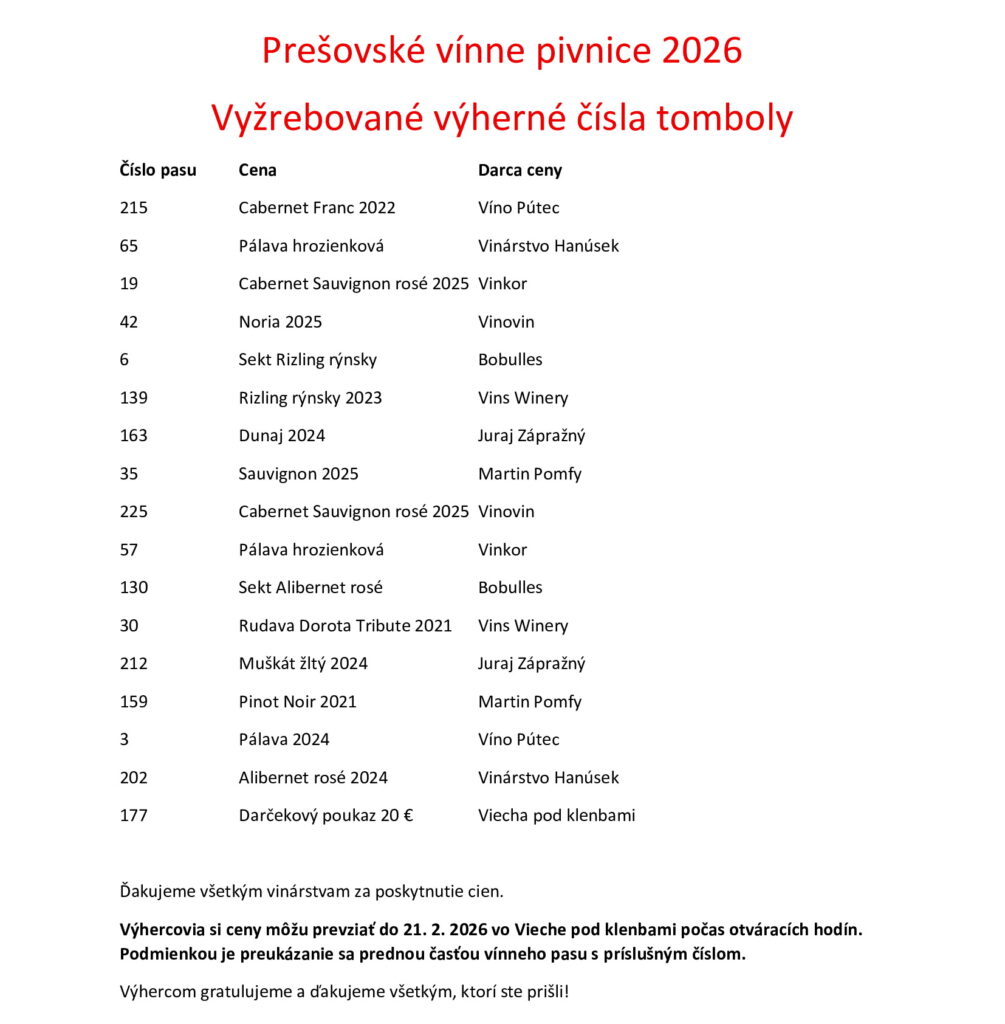 Tombolu vyžrebuje organizátor 12. 2. 2026 a výherné čísla budú zverejnené na FB profile Viechy pod klenbami.